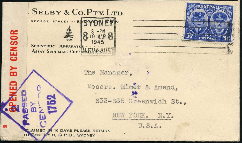 | 2656 | 15 € | ZENSURPOST II. WELTKRIEG (1.9.1939 - 8.5.1945) : AUSTRALIEN 1945 (3.3.) 3 1/2 d. General-Governeur + MaStrichSt.: SIDNEY/8 + roter Zensur-Verschlußzettel: 2/OPENED BY CENSOR (Wo.I b/2) + viol. Rhombus: 2/PASSED/BY/CENSOR/1762 (Wo.I a/3) Übersee-Zensur-Bf. n. New York (Mi.170 EF) | | |