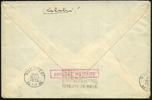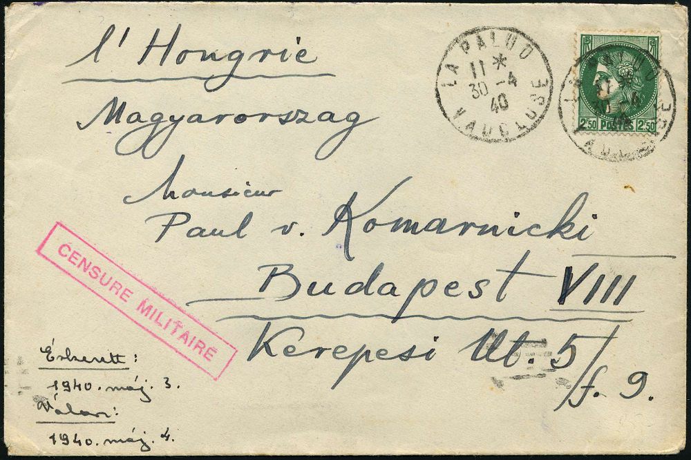 | 2662 | 28 € | ZENSURPOST II. WELTKRIEG (1.9.1939 - 8.5.1945) : FRANKREICH 1940 (30.4.) 2,50 F. Ceres, grün EF, 1K: LA PALOU + viol. Ra.: CENSURE MILITAIRE (vs + ts.) Wo. unbekannt! = "Sitzkrieg"-Periode!, seltener Ausl.-Zensur-Bf. n. Budapest! = Achsen-Partner! , rs. MaWSt-AS (Mi.403 EF) | | |
