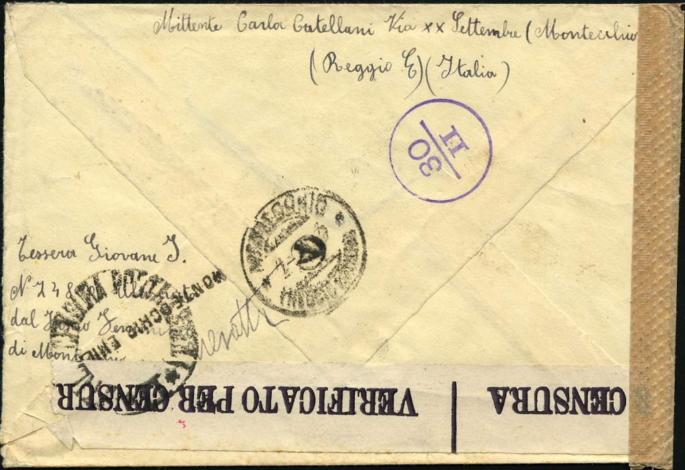 | 2675 | 18 € | ZENSURPOST II. WELTKRIEG (1.9.1939 - 8.5.1945) : ITALIEN 1943 (2.3.) 1,25 L. Freimarke (Mi.646 EF), 1K-Brücke: MONTECCHIO/(REGGIO EMILIA) + rs. ital. Zensurstreifen: VERIFICATO PER CENSURA (endlos) u.a. + lila Eingangs-Band-Zensur-St.: OKW / (d) = München (Rie.D-21 lila) u.a., Ausl.-Doppel-Zensur-Bf. n. Hehlen/ Holzminden (wahrscheinl. Fremd-/ Zwangsarbeiter) | | |