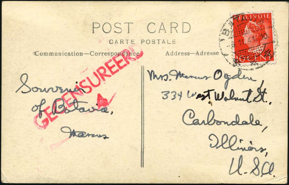 | 2684 | 20 € | ZENSURPOST II. WELTKRIEG (1.9.1939 - 8.5.1945) : NIEDERL.INDIEN 1941 (8.11.) 10 C. Freimarke, rot + 1K: BATAVIA/xxx + roter Zensur-2L: GECENSUREERD/4 (Wo.1) Übersee-Zensur-Ak. (Kirche Kotta Baru) n. U.S.A. (nur 1 Monat vor Pearl Harbour) | | |
