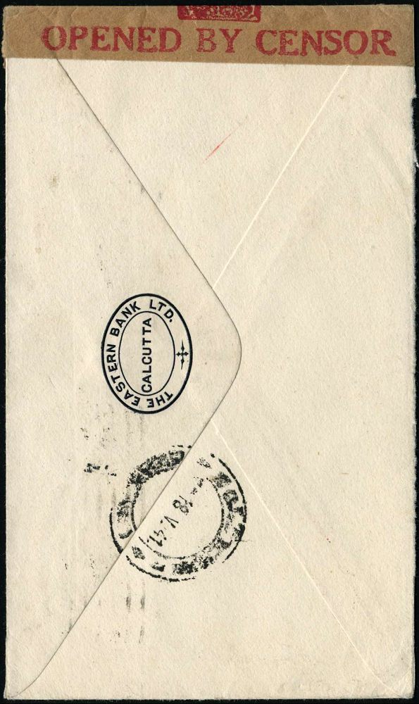 | 2672 | 16 € | ZENSURPOST II. WELTKRIEG (1.9.1939 - 8.5.1945) : INDIEN 1941 (9.3.) Ma.-WellenSt.: CALCUTTA/FOR + Dreieck-Zensur-HdN: PASSED BY/CENSOR/A 6 (Wo.8) + brauner Verschluß-Zettel: OPENED BY CENSOR (Wo.2) Ausl.-Bank-Zensur-Bf. n. Teheran, rs.AS | | |