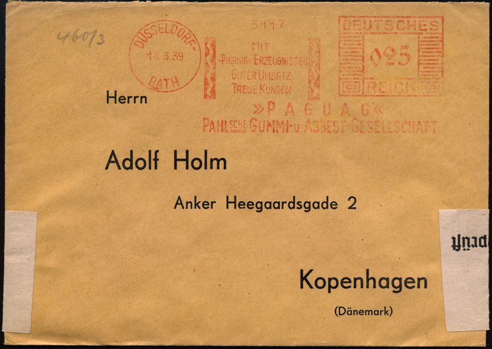| 2628 | 25 € | ZENSURPOST II. WELTKRIEG (1.9.1939 - 8.5.1945) : DÜSSELDORF-/ RATH/ .."PAGUAG"/ PAHLSCHE GUMMI-u.ASBEST-GESELLSCHAFT 1939 (16.3.) AFS Francotyp "Mäanderrechteck" 025 Pf., Stpl.-Irrtum 1940 (2 Schlauchstücke) + rs. OKW-Zensurstreifen + roter 1K. (= Berlin, Rie.B-2 a, B-51) Ausl.-Firmen- Zensur-Bf. n. Kopenhagen, sehr frühe Zensur 1940! (Dü.E-2BAh) | | |