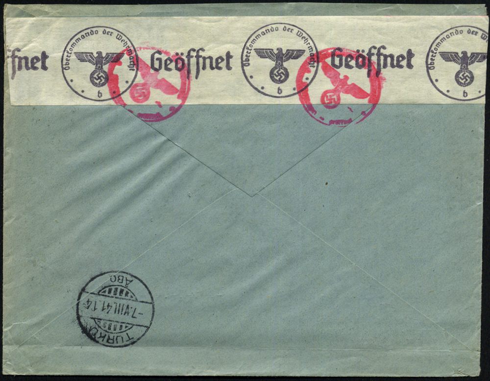 | 2641 | 25 € | ZENSURPOST II. WELTKRIEG (1.9.1939 - 8.5.1945) : STETTIN 1/ NOTRACO/ GMBH/ IMMER IM DIENSTE DES VERKEHRS 1941 (2.8.) AFS Francotyp "Reichsadler" 070 Pf. = geflügeltes Rad + RZ: Stettin 1/o + rs. roter Zensur-1K (abgenutzt) + OKW-Zensurstreifen "Geöffnet/b" (Rie.B-2, B-55) Firmen-Bf. mit Firmen-Flagge (unten Querfalte) + viol. finnischer Eingangs-Zensur-3K: TARKASTETTU - GRANSKAT/93 Wo.Ausl.-Doppel-Zensur-Bf. n. Turku, seltene Portostufe (Dü.E-5CG) | | |