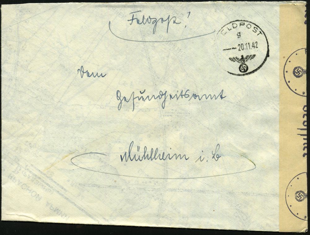 | 2649 | 18 € | ZENSURPOST II. WELTKRIEG (1.9.1939 - 8.5.1945) : DEUTSCHES REICH 1942 (20.11.) 1K: FELDPOST/g/--- + Feldpost-Zensurstreifen "Geöffnet" (Mi.1) Recycling-Feldpost-Brief aus sowjet. Generalstabskarte ohne Abs. und Briefstempel, daher zensiert an Gesundheitsamt Müllheim, Baden | | |