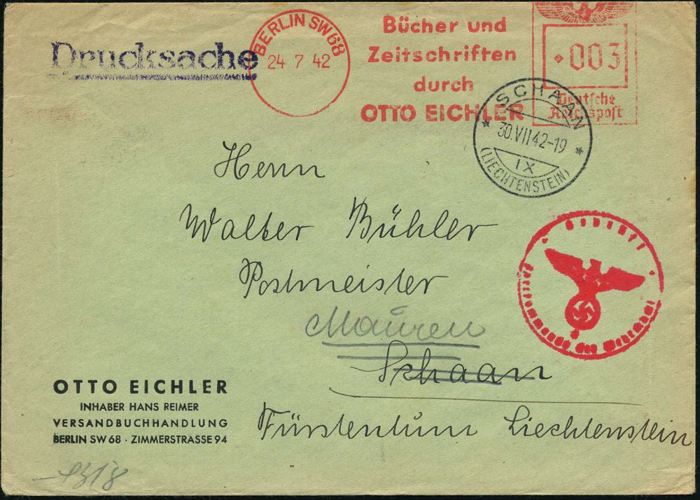 | 2620 | 23 € | ZENSURPOST II. WELTKRIEG (1.9.1939 - 8.5.1945) : BERLIN SW 68/ Bücher u./ Zeitschriften/ OTTO EICHLER 1942 (24.7.) AFS Francotyp "Reichsadler" 003 Pf. unbeanstandete Ausl.-Drs. (= Inl.-Tarif) + roter OKW-Zensur-1K "e" (= Ffm./Rie.3 a) + AS: SCHAAN/IX/ (LIECHTENSTEIN), seltene, unterfrankierte Ausl.-Zensur-Drs. n. Mauren, seltene Destination! (Dü.E-5DG) | | |