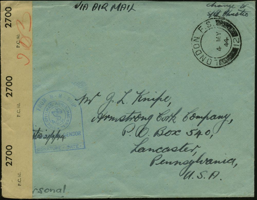 | 2671 | 16 € | ZENSURPOST II. WELTKRIEG (1.9.1939 - 8.5.1945) : GROSSBRITANNIEN 1944 (4.5.) 2K: LONDON F.S./12 + bl. Zensur-HdN: FROM H-M-SHIP/SIGN: OFFI: MAG: ADMIR: MAG: BR:/PASSED BY CENSOR ("B" spiegelverkehrt, Schildform) = Wo. unbekannt + Zensurstreifen 2700 /"P.C. 90", Übersee-Flp.-Feldpost-Zensur-Bf. n.USA | | |
