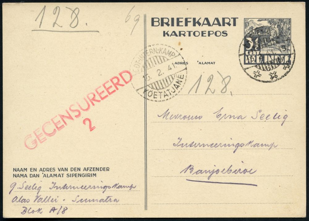 | 2683 | 45 € | ZENSURPOST II. WELTKRIEG (1.9.1939 - 8.5.1945) : NIEDERL.INDIEN 1941 (15.2.) 1K-Gitter: MEDAAN/*** + roter Zensur-2L: GECENSUREED/2 (Wo.2) auf Inl.-P 3 1/2 C. Landschaft, grau eines deutschen Zivil-Internierten mit hs. Abs.: "..Jnternierungskamp Olas Vallei, Sumatra" + 1K-Gitter: CDT-INTERN.-KAMP/ KOETATJANE (Wolter unbekannt) an deutsche Zivil-Internierte, seltene Internierungs-Zensur-Kt. Camp an Camp (vor dem Angriff Japans) | | |