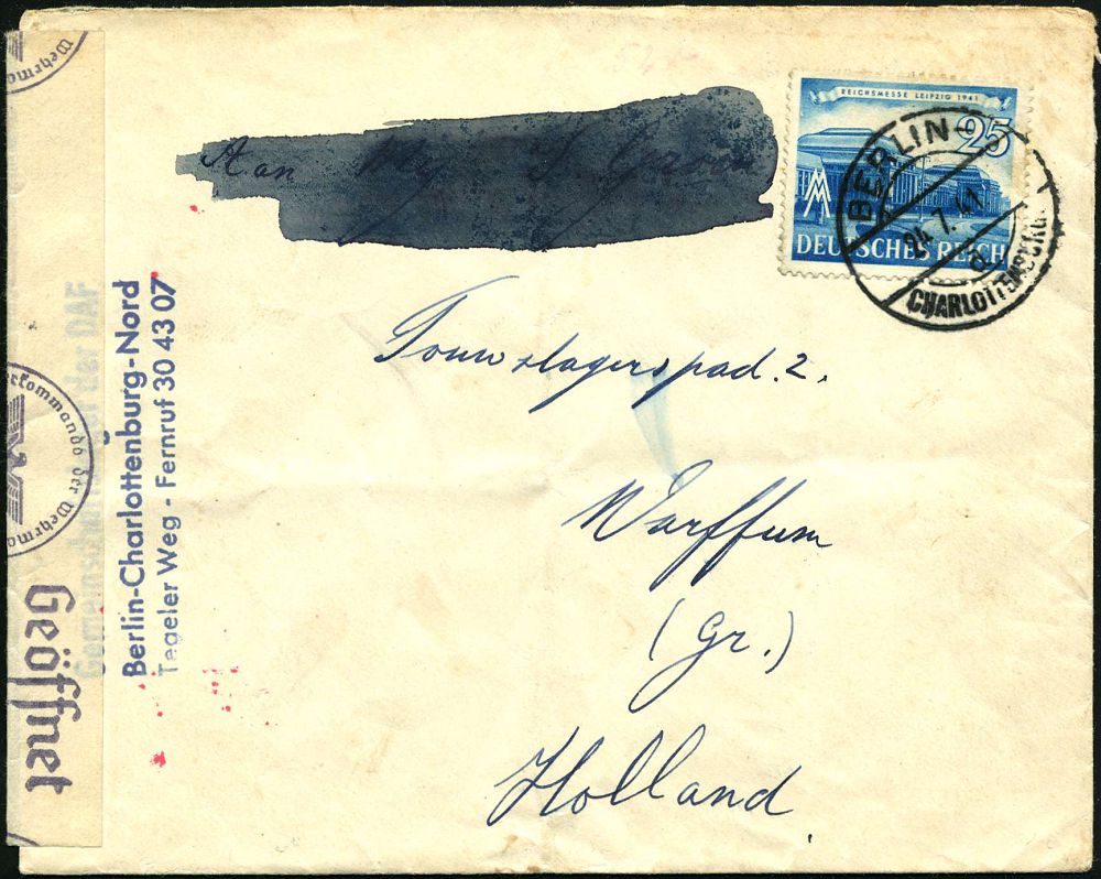 | 2621 | 35 € | ZENSURPOST II. WELTKRIEG (1.9.1939 - 8.5.1945) : BERLIN-/ CHARLOTTENBURG/ d 1941 (24.7.) 1K-Brücke auf EF 25 Pf. Leipz. Messe = Hbhf. + Abs.-3L: Gemeinschaftslager der DAF/Berlin-Charlottenburg Nord/Tegeler Weg.. + rs. hs. Abs.:"Gemeinschaftslager 35.." = holländischer Zwangsarbeiter, Name des Empfängers geschwärzt! + OKW-Zensurstreifen + roter 1K "c" = Köln (Rie.C-5 d, C-55), Ausl.-Zensur-Bf. n. Warffum, Gr. (Mi.767 EF + 60.- EUR) | | |