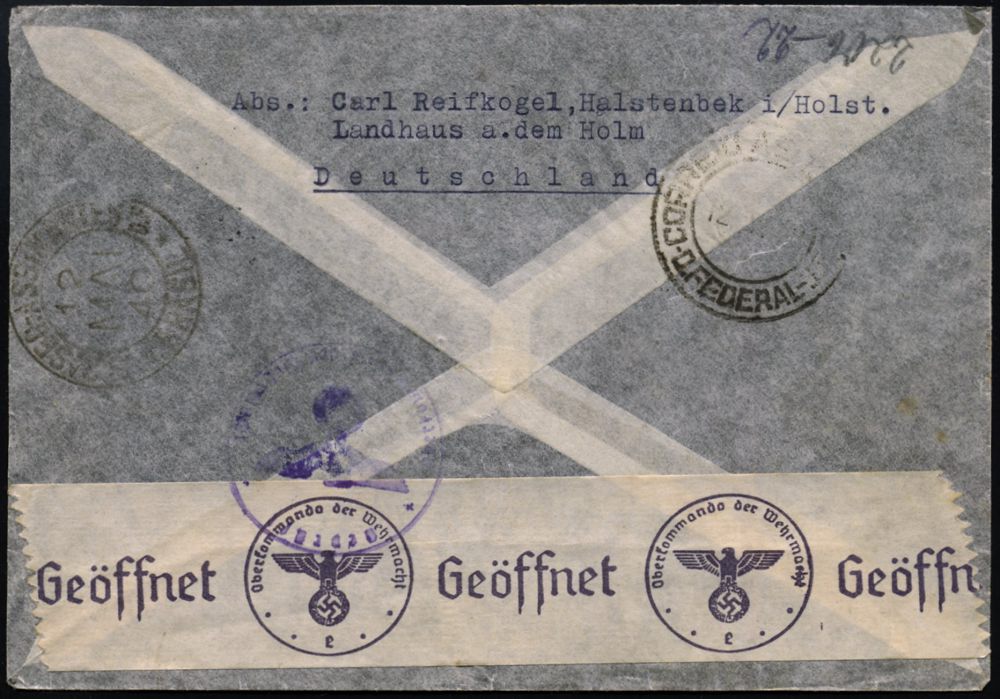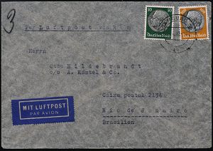 | 2629 | 35 € | ZENSURPOST II. WELTKRIEG (1.9.1939 - 8.5.1945) : HAMBURG 18/ ab 1940 (29.4.) 2K-Steg auf 50 Pf. u. 100 Pf. Hindenbg. + Vermerk "Per Luftpost via Rom" = via LATI nach Ein-stellung des deutschen Katapult-Dienstes ! + rs. OKW-Zensurstreifen "e" + viol. Zensur-1K = Frankfurt/M. (Rie.E-2, E-53) Übersee-Flp.-Zensur-Bf. n. Rio de Janeiro, rs. AS (Mi.525, 528) | | |