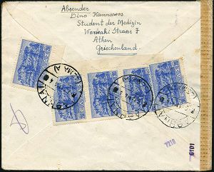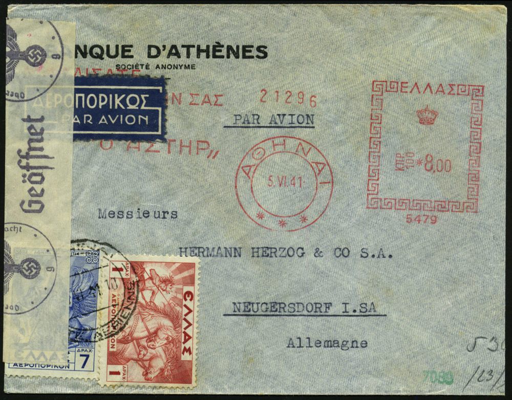 | 2667 | 25 € | ZENSURPOST II. WELTKRIEG (1.9.1939 - 8.5.1945) : GRIECHENLAND 1941 (5.6.) 1 Dr. "Sonnenwagen des Helios" u. 7 Dr. "Zeuss raubt Ganymed", satzreine Zusatzfrankatur + AFS 8 Dr.: ATHINAI/BANQUE D´ATHENES + OKW-Eingangs-Zensur Wien (1K + Streifen "Geöffnet" , Rie.G-3 a, G-53 a) rs. Bank-Siegeloblate "Pallas Athene", seltener Ausl.-Zensur-Flp.-Bf. n. Neugersdorf (Mi.374, 377) | | |