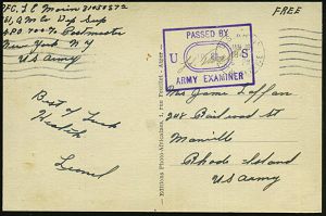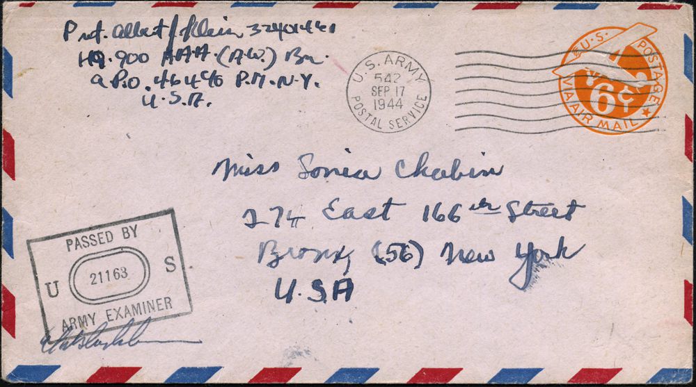 | 2700 | 12 € | ZENSURPOST II. WELTKRIEG (1.9.1939 - 8.5.1945) : U.S.A. 1944 (17.9.) MaWellenSt.: U.S. ARMY/542/POSTAL SERVICE auf LU 6 C. Flugzeug, orange + schw. Zensur-Ra.: PASSED BY/U 21163 S/ ARMY EXAMINER (Doppel-Oval = Wo.1 c) , hs. ".. P.O. 46 446 P.M. N.Y.", Flp.-Feldpost-Zensur-Bf. n. New York, weitere US-Zensur-Briefe siehe Sektion: II. WELTKRIEG | | |