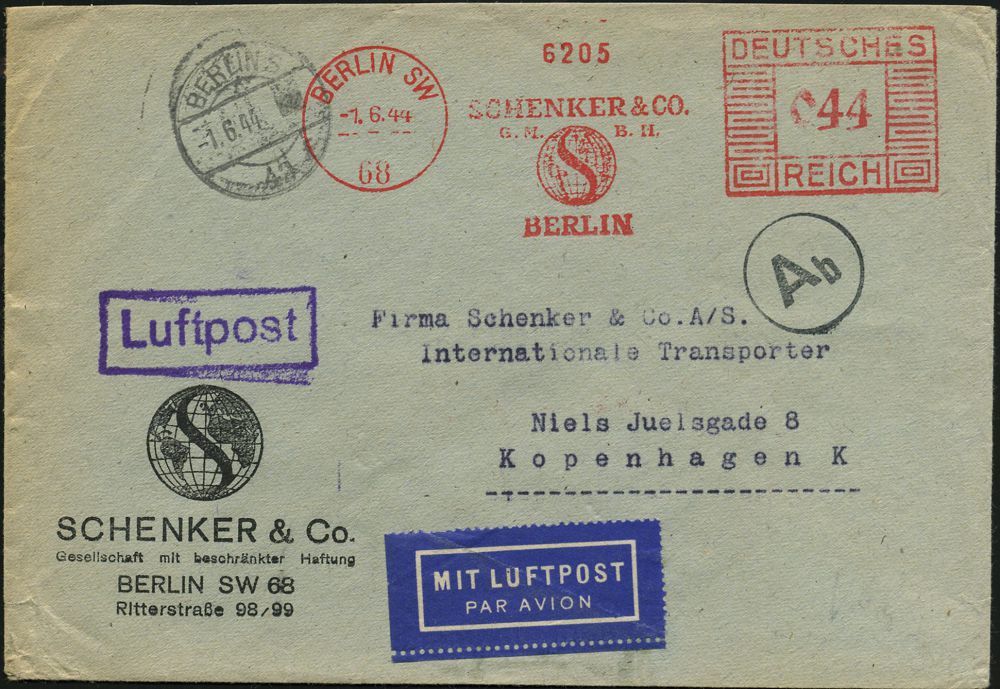 | 2625 | 20 € | ZENSURPOST II. WELTKRIEG (1.9.1939 - 8.5.1945) : BERLIN SW/ 68/ SCHENKER & Co/ GMBH.. 1944 (31.5.) AFS Francotyp "Mäanderrechteck" 003 Pf. (Monogr.-Logo: Globus) + viol. OKW-Zensur-1K (Durchlauf-Zensur): A b = Berlin (Rie.B-32, + 50 Pkte.) 1K-Brücke: BERLIN S/42/f mit geblockter Uhrzeit, motivgl. Firmen-Ausl.-Zensur-Bf. n. Kopenhagen, Inl.-Drs.-Tarif = Europa-Tarif, vergl. Los Nr.2626 (Dü.E-2BAh) | | |