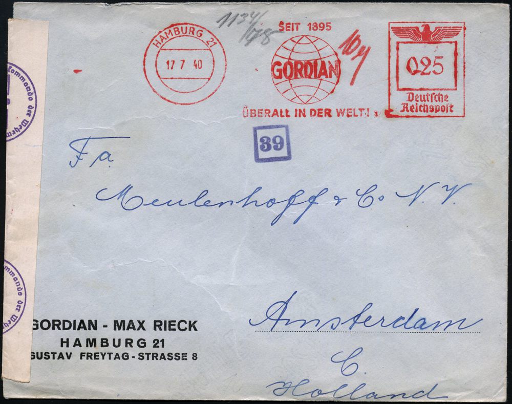| 2630 | 25 € | ZENSURPOST II. WELTKRIEG (1.9.1939 - 8.5.1945) : HAMBURG 21/ SEIT 1895/ GORDIAN.. 1940 (17.7.) AFS Francotyp "Reichsadler" 025 Pf. (Globus) + OKW-Zensurstreifen "c" + 1K: ohne UB = Köln (Rie. C-3 c 100 Pkte., C-54, 350 Pkte., zus. 450 Pkte.!) seltener Ausl.-Zensur-Bf. n. Amsterdam (Dü.E-5CEo) | | |