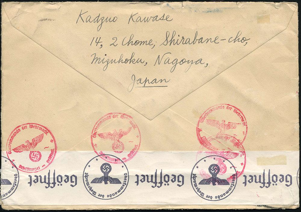 | 2678 | 25 € | ZENSURPOST II. WELTKRIEG (1.9.1939 - 8.5.1945) : JAPAN 1940 (3.7.) 4 S. Admiral Togo, senkr. 5er-Streifen (Nagoya) + OKW-Zensurstreifen + roter OKW-1K mehrfach (= Berlin, Rie.B-2 a, B-54) Post ging nach Hitler-Stalin-Pakt über Sowjet-Union!, seltener Übersee-Zensur-Bf. (kl. Öffnungsmäng.) n. Halle/Saale (Mi.257 MeF) | | |