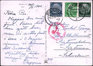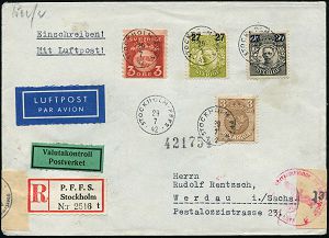 | 2690 | 28 € | ZENSURPOST II. WELTKRIEG (1.9.1939 - 8.5.1945) : SCHWEDEN 1944 (30.12.) 5 Öre "300 Jahre Seekarte", 2 x + 30 Öre Linienschiff "Kung Karl" auf Firmen-Bf.: A-B. Gust. Carlsson & Co., Stockholm 1,(schwache Falte) vs. roter BdMaSt.: GEÖFFNET/Zensur-/Stelle/(b) = Gestapo-Zensur RSHA, Berlin (Rie.B-25, + 750 Pkte.!) + neutraler Riffelstreifen (B-56) seltener Ausl.-Zensur-Bf. n. Dresden (Mi.2x 304, 308) | | |