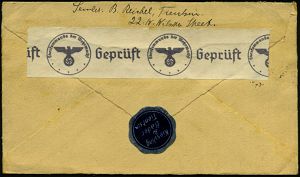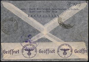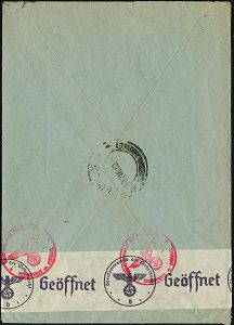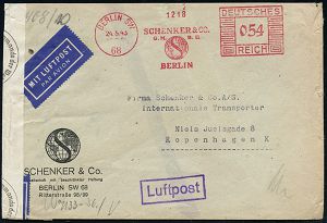 | 2622 | 30 € | ZENSURPOST II. WELTKRIEG (1.9.1939 - 8.5.1945) : BERLIN SW/ 68/ SCHENKER & CO./ GMBH 1943 (24.5.) AFS Francotyp "Mäanderrechteck" 054 Pf. (Firmenlogo: Globus) + OKW-Zensurstreifen "Geöffnet/b" + 2x 1K: Geprüft/b mit Tilde (= Berlin, Rie.B-8, B-53 a, + 200 Pkte.) Ausl.-Zensur-Flp.-Bf. n. Kopenhagen, seltene Portostufe = 3. Gew.-Stufe Luftpost-Ausland (Dü.E-2BAh) | | |