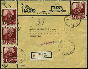 | 2687 | 18 € | ZENSURPOST II. WELTKRIEG (1.9.1939 - 8.5.1945) : RUMÄNIEN 1940 (Feb.) 6 L. König Karl II. in Galauniform m.Pickelhaube, reine MeF: 4 Stück + rs. OKW-Zensur-Streifen (Rie. B-54 = Berlin, + 150 Pte.) + RZ: BUCURESTI 1, Ausl.-Zensur-R-Bf. n. Osnabrück (Mi.498 MeF) | | |