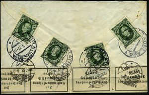 | 2632 | 65 € | ZENSURPOST II. WELTKRIEG (1.9.1939 - 8.5.1945) : ISERLOHN/ 1/ AAP/ AlbeTr Ackermann Nachf./ Pick & Schulte/ Vereinigte Schloß-u.Beschlägefabrik 1939 (25.10.) AFS Francotyp "Reichsadler" 025 Pf. (Firmen-Logo) + viol. OKW-Zensur-1K: Auslandsnachrichtenprüfstelle/ Königsberg (Pr.) + rs. desgl. + 1L: Jm Staatsinteresse geöffnet + Paraphe + vs. viol. 1L: Von der Wehmacht zugelassen (Rie.A-1, A-70, A-72 = LP.!, s e h r seltener Ausl.-Zensur-Bf. n. Riga (Dü.E-5CE) | | |