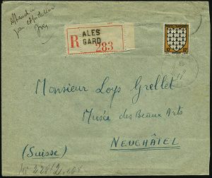 | 2664 | 25 € | ZENSURPOST II. WELTKRIEG (1.9.1939 - 8.5.1945) : FRANKREICH 1943 (6.5.) 1K: ALES/GARD, EF 10 F. Wapen + provis. RZ: ALES/GARD + rs. OKW-Zensurstreifen "Geöffnet/l" + viol. 1K = Lyon! (Rie.L-2, L-50 + insges. + 550 Pkte.!) Ausl.-Zensur-R-Bf. in die Schweiz (Mi.586 EF) | | |