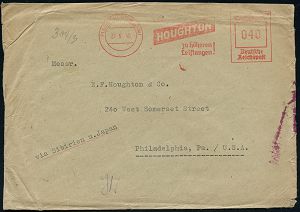 | 2638 | 35 € | ZENSURPOST II. WELTKRIEG (1.9.1939 - 8.5.1945) : MAGDEBURG-BUCKAU/ HOUGHTON.. 1940 (31.5.) AFS Francotyp "Reichsadler" 040 Pf. + Zusatz "via Sibirien u. Japan" + rs. roter OKW-Zensur-1K + Zensurstreifen "Geöffnet.." = Berlin (Rie.B-2 c = Lp.!, B-54, + 150 Pkte.) rs. Abs.: DEUTSCHE HOUGHTON FABRIK. = US-Firma (Fleck u. Randmäng.) seltener Übersee-Zensur-Bf. n. U.S.A. = Leitweg via Rußland (Sibirien) u. Japan wöhrend Hitler-Stalin-Paktes!, seltener Beleg! | | |