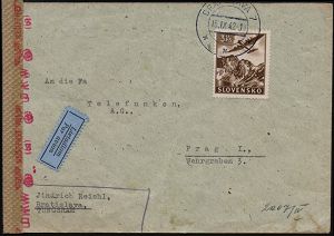 | 2696 | 16 € | ZENSURPOST II. WELTKRIEG (1.9.1939 - 8.5.1945) : SLOWAKEI 1940 (1.8.) 2,50 Kr. Provisorium, EF + BdMWSt.: BRATISLAVA/***/PRIHLASUJTE SA/..ROZHLASU. (Radio-Sendemast) + OKW-Zensurstreifen: Geöffnet/g = Wien (Rie.G-53 a) Ausl.-Firmen-Zensur-Bf. ins Protektorat n. Prag (Mi.17 EF) | | |