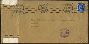 | 2661 | 15 € | ZENSURPOST II. WELTKRIEG (1.9.1939 - 8.5.1945) : FINNLAND 1940 (2.12.) 3 1/2 Mk. Wappenlöwe blau, EF + viol. finn. Zensur-3K: TARKASTETTU/GRASKAT/32 (Wo.1) + OKW-Zensurstreifen + roter 1K. = Berlin (Rie.B-3 a, B-51) als Transit-Zensur , seltener Ausl.-Doppel-Zensur-Bf. n.Holland (Mi.198 EF) | | |