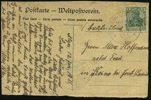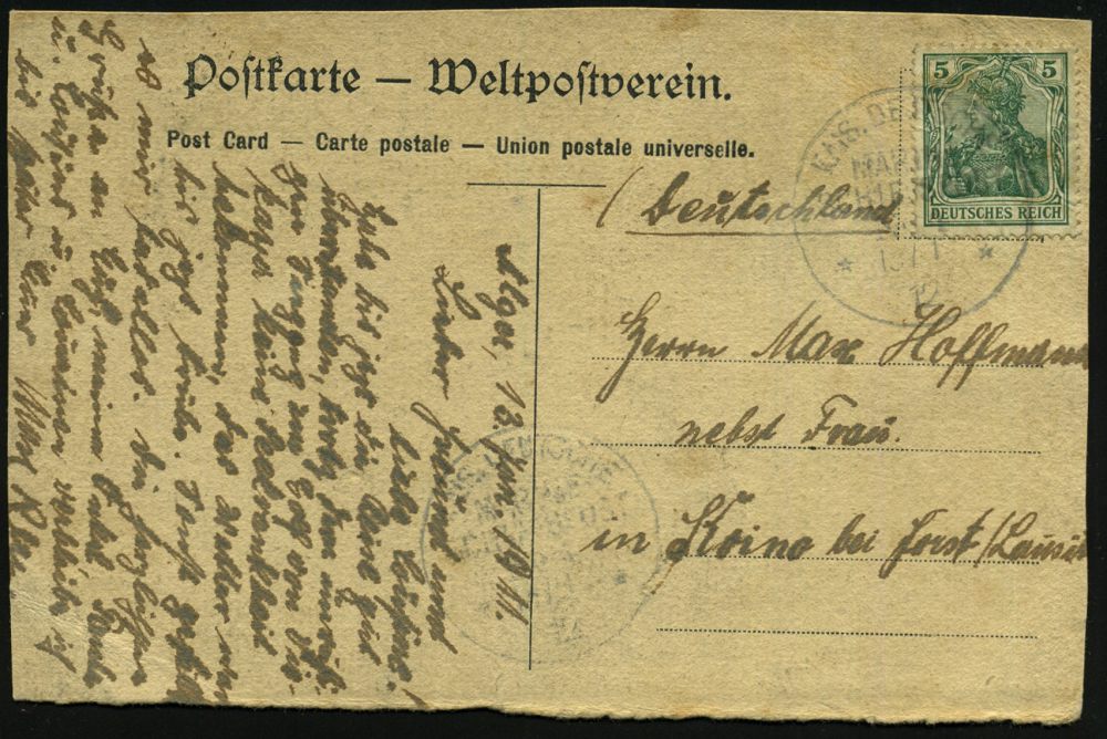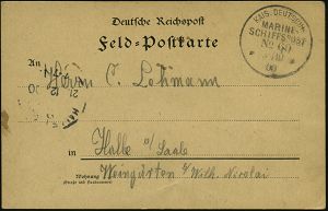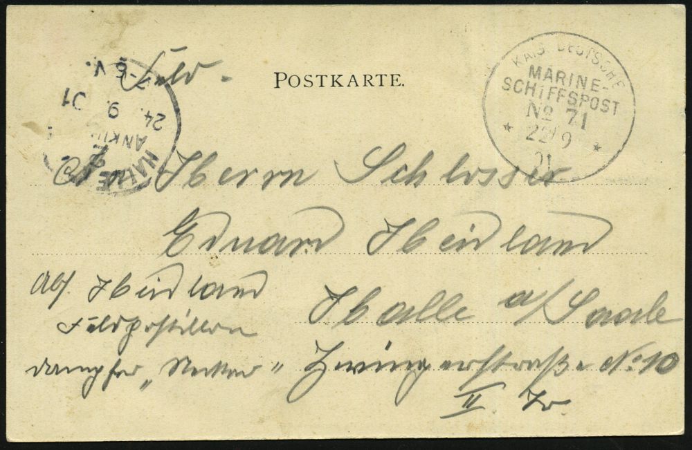 | 150 | 25 € | DEUTSCHE KOLONIAL-GESCHICHTE / KOLONIALKRIEGE : DEUTSCHES REICH 1906 (18.1.) 1K-BPA.: KAIS. DEUTSCHE/MARINE-/SCHIFFSPOST/No.41/** = Kadetten-Schulschiff S.M.S. "Stein" auf EF 10 Pf. Germania + hs. Abs.: S.M.S. "Stein" = 9. Ausbildungsreise Island - Spanien - Ägypten - Mittelmeer, 2x klar gest. Fern-Bf. n. Leipzig (Mi.71 EF) | | |