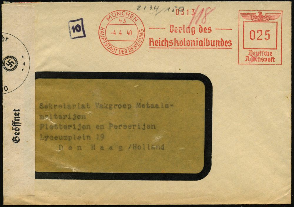 | 130 | 25 € | DEUTSCHE KOLONIAL-GESCHICHTE / KOLONIALKRIEGE : MÜNCHEN/ 43/ HDB/ Verlag d./ Reichskolonialbundes 1940 (4.4.) AFS Francotyp "Reichsadler" 025 Pf. + OKW-Zensurstreifen "Geöffnet" + roter 1K (= Köln) klar gest. Ausl-Zensur-Bf., seltene Destination! (Dü.E-5CGh) | | |