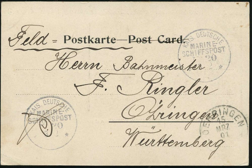 | 145 | 35 € | DEUTSCHE KOLONIAL-GESCHICHTE / KOLONIALKRIEGE : DEUTSCHES REICH / CHINA 1901 (3.2.) 1K-BPA: KAIS. DEUTSCHE/MARINE-/SCHIFFSPOST/No.20/** = S.M.S. "Jltis" 2x auf Feldpost-Ak.: Bersaglieri (ital. Spezialtruppen) aus Hankau n. Öhringen (AS) = Einsatz Boxeraufstand | | |