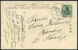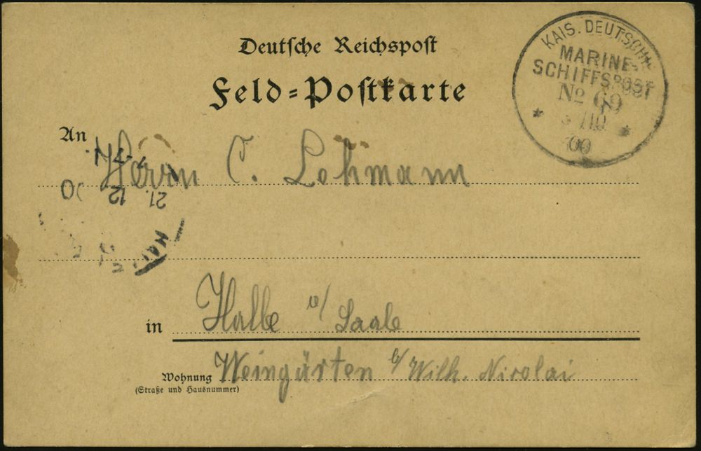 | 141 | 50 € | DEUTSCHE KOLONIAL-GESCHICHTE / KOLONIALKRIEGE : DEUTSCHES REICH / CHINA 1900 (6.10.) 1K-BPA: KAIS. DEUTSCHE/MARINE-/SCHIFFSPOST/No.69/** = NDL-Dampfer "Roland" ,Versorger, II. Staffel Boxeraufstand (China) Feldpost-Vordr.-Kt. aus Fort Taku n.Halle, sehr selten!, nur e i n e Reise (Feldpost nur 7.9.-31.10.) | | |