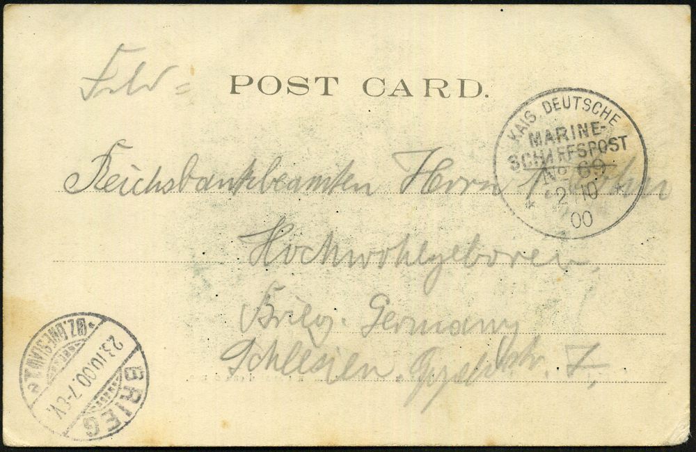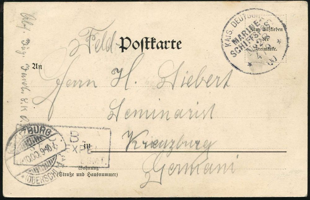 | 139 | 35 € | DEUTSCHE KOLONIAL-GESCHICHTE / KOLONIALKRIEGE : DEUTSCHES REICH / CHINA 1900 (4.9.) 1K-BPA: KAIS. DEUTSCHE/MARINE-/SCHIFFSPOST/No.28/** = Dampfer "Batavia" + schw. Truppen-HdN (teils etw. undeutl.) Feldpost-Ak.: Tsingtau = I. Transportstaffel Boxeraufstand n. Kreuzburg/OS. (AS), selten! | | |