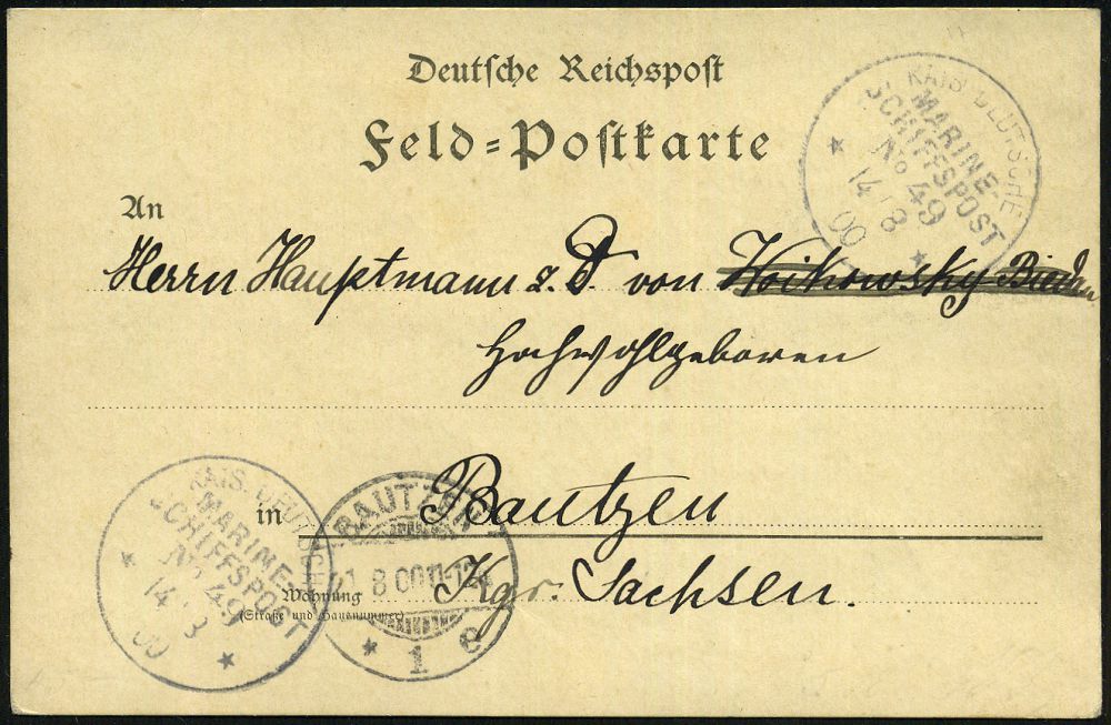 | 137 | 28 € | DEUTSCHE KOLONIAL-GESCHICHTE / KOLONIALKRIEGE : DEUTSCHES REICH / CHINA 1900 (14.8.) 1K-BPA: KAIS. DEUTSCHE/MARINE-/SCHIFFSPOST/No.49/** = gecharterter NDL-Versorgungs-Dampfer "Strassburg" , 2x auf Feldpost-Karte, Truppen-Transport Boxeraufstand, China, rs. hs. Abs.: "An Bord der Strassburg" n. Bautzen, vs. AS. | | |
