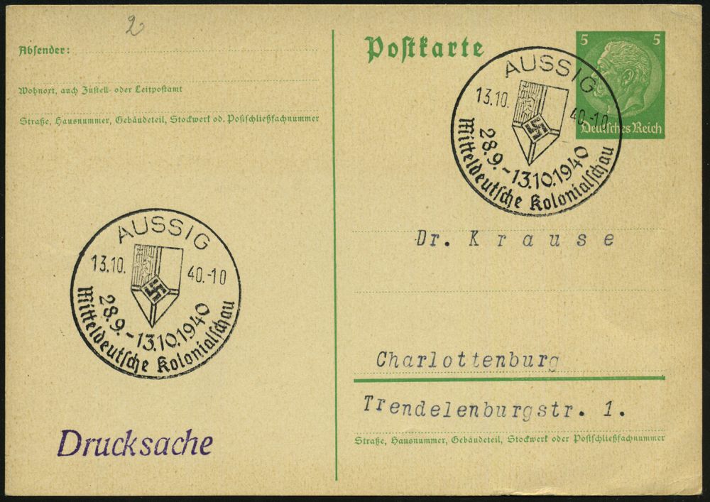 | 116 | 15 € | DEUTSCHE KOLONIAL-GESCHICHTE / KOLONIALKRIEGE : AUSSIG/ Mitteldeutsche Kolonialschau 1940 (13.10.) SSt = NS-Reichs-Kolonialflagge , Inl.-Karte (Bo.2) | | |