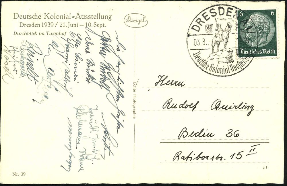 | 122 | 18 € | DEUTSCHE KOLONIAL-GESCHICHTE / KOLONIALKRIEGE : DRESDEN A1/ Deutsche Kolonial-Ausstellung 1939 (3.8.) SSt = Schutztruppen-Reiterstandbild (= "Der Reiter von Südwest" in Windhuk) seltene s/w.-Sonderkarte: Deutsche Kolonial-Ausstellung 1939, Turmhof, Bedarf (Bo.91) | | |
