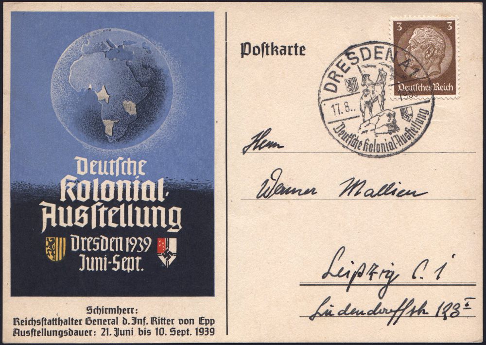 | 123 | 20 € | DEUTSCHE KOLONIAL-GESCHICHTE / KOLONIALKRIEGE : DRESDEN A1/ Deutsche Kolonial-Ausstellung 1939 (17.8.) SSt = Schutztruppen-Denkmal Windhuk (= "Der Reiter von Südwest" in Windhoek) Color-Sonder-Kt.: Deutsche Kolonial Ausstellung (Globus mit Afrika etc.) seltene Inl.Kt. (Bo.91) | | |