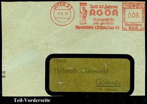 | 127 | 15 € | DEUTSCHE KOLONIAL-GESCHICHTE / KOLONIALKRIEGE : LEIPZIG S3/ Seit 35 Jahren/ AGGA/ ..Nährmittelfabrik.. 1937 (3.6.) AFS = Kolonial-Soldat mit Rucksack u.Standarte (AFS bekam neuen OrtsStpl: Markkleeberg!) seltene Teil-Vorderseite (Dü.E-3CE) | | |