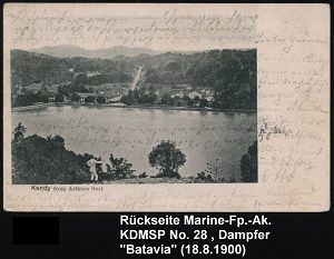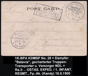 | 138 | 35 € | DEUTSCHE KOLONIAL-GESCHICHTE / KOLONIALKRIEGE : DEUTSCHES REICH / CHINA 1900 (18.8.) 1K-BPA: KAIS. DEUTSCHE/MARINE-/SCHIFFSPOST/No.28/** = Dampfer "Batavia" ,gecharterter NDL-Versorgungs-Dampfer + schw. Ra.3: S. B./OSTAS. EXPED./1. INFANT. REGMT., klar gest. Feldpost-Ak. (Kandy) n. Berlin, = Truppentransport I. Staffel, Boxeraufstand! | | |