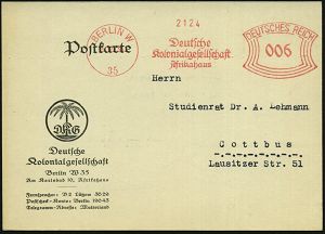 | 118 | 18 € | DEUTSCHE KOLONIAL-GESCHICHTE / KOLONIALKRIEGE : BERLIN W/ 35/ Deutsche/ Kolonialgesellschaft/ Afrikahaus 1935 (8.11.) AFS Francotyp "Bogenrechteck" auf dekorativer Vordruck-Kt : "D K G" mit Palmen-Logo, in der NS-Zeit nur bis 1936 unverändert, dann mit Hakenkreuz, seltene Fernkt. (Dü.E-1CBh) | | |