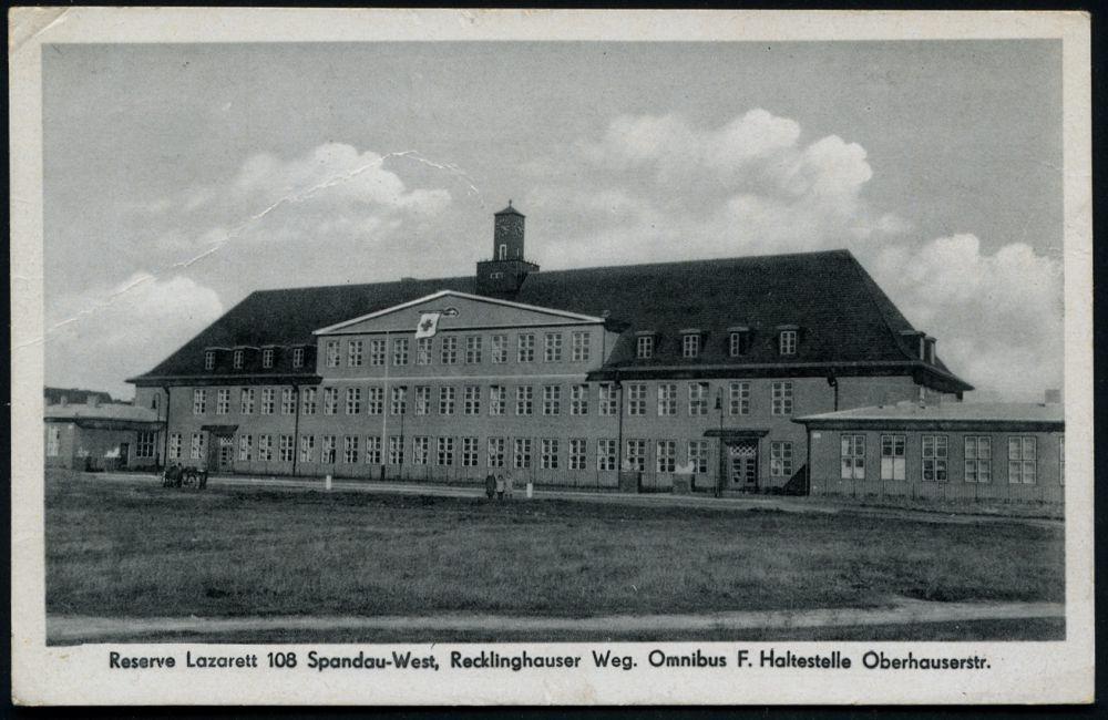 | 2705 | 12 € | II WK: ROTES KREUZ / LAZARETTE / SANITÄTSDIENSTE : Berlin-Spandau 1940 (8.7.) Serien-MWSt.: BERLIN-SPANDAU 1/ba/Vergiss nicht Strasse/u. Hausnummer.. + viol. 1K-HdN: Reserve-Lazarett 108 + hs. Abs. auf passender s/w.-Foto-Ak.: Reserve Lazarett 108 Spandau-West.. (Beförd.-Spuren), Feldpost-Kt., schöne Kombination! | | |
