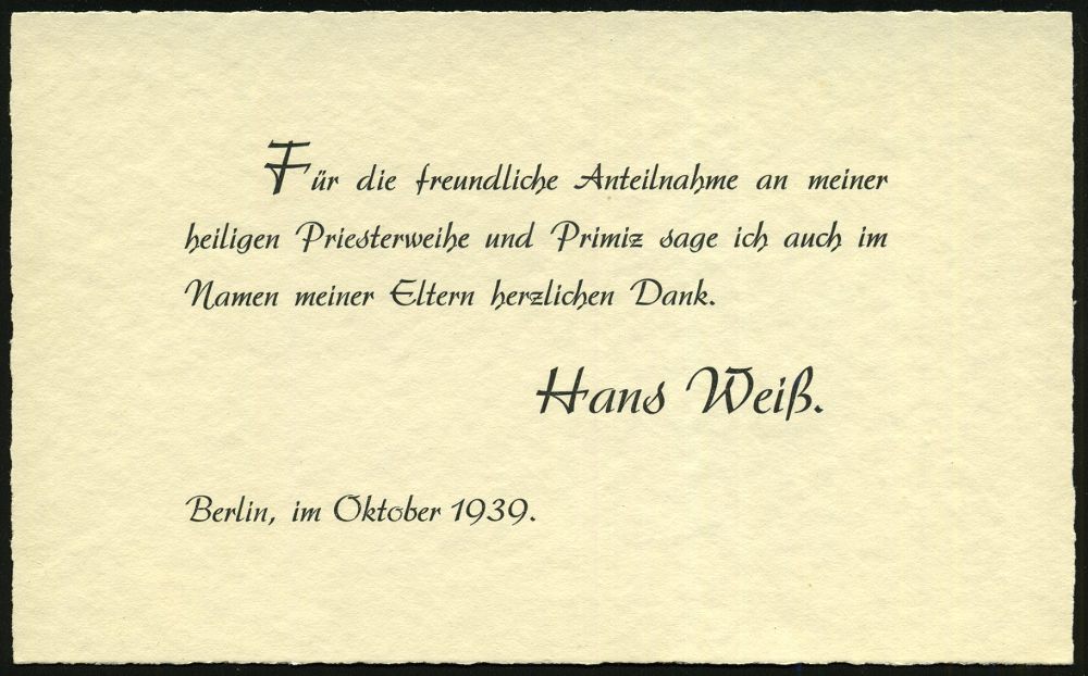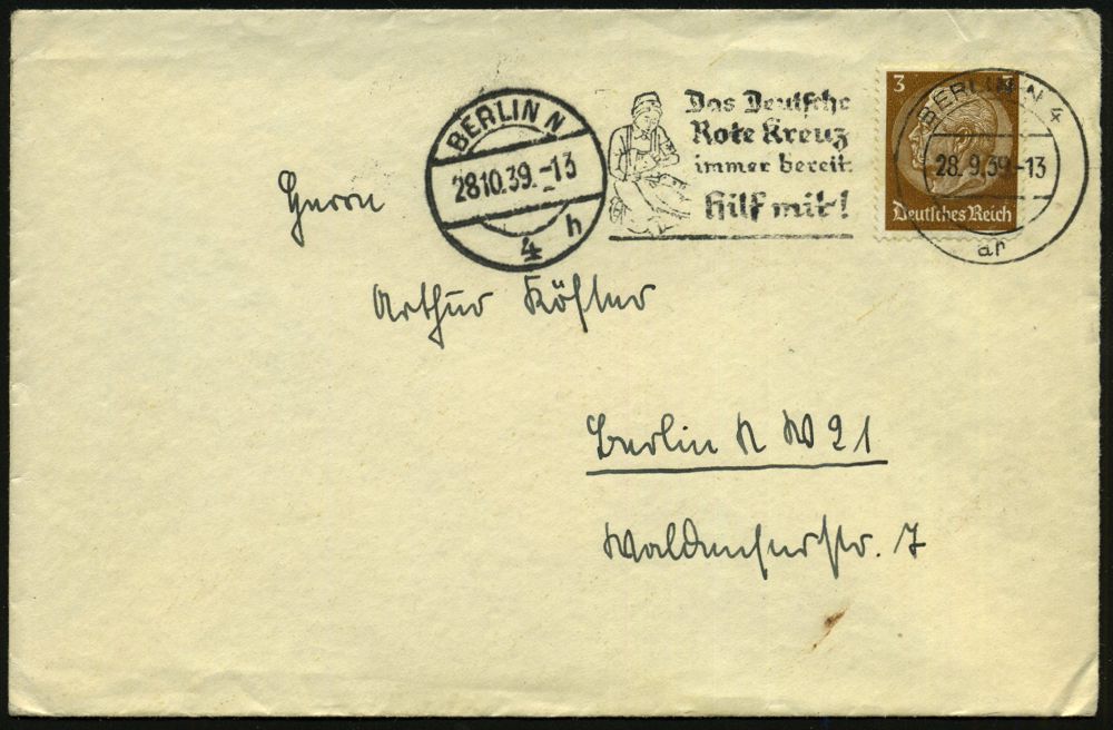 | 2701 | 25 € | II WK: ROTES KREUZ / LAZARETTE / SANITÄTSDIENSTE : BERLIN N 4/ ar/ Das Deutsche/ Rote Kreuz/ immer bereit.. 1939 (28.9.) Serien-MWSt = RK-Schwester m. Verwundetem + 1K: BERLIN N/4/h vom 28.10., da Datumsirrtum, Ortsbf. mit interess. Inhalt: Dank für Anteilnahme an der Priesterweihe + 2 Andachtsbildchen, 4 Belege kompl.!, interessante Doku zum II. Weltkrieg! (Bo.S 337 A, nur 3 Monate verwendet!) | | |