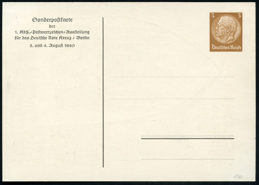 | 2703 | 30 € | II WK: ROTES KREUZ / LAZARETTE / SANITÄTSDIENSTE : Berlin 1940 (Aug.) PP 3 Pf. Hindenbg., braun: dieser Schild deckt unsere wunden Kämpfer, Stärkt das Deutsche Rote Kreuz! (Verwundeter Soldat vor RK-Schild, signiert Mjölnir) = Rotkreuz-Ausstellung Berlin, ungebr., selten! (Frech PP 122/C 112) | | |