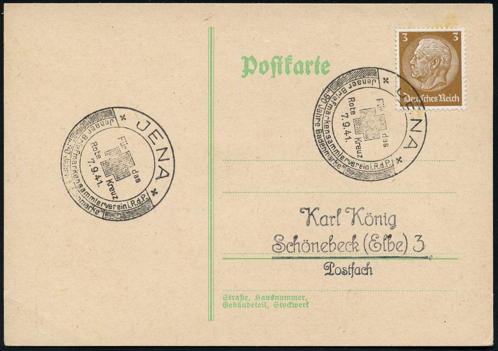 | 2712 | 16 € | II WK: ROTES KREUZ / LAZARETTE / SANITÄTSDIENSTE : JENA/ Für d./ Rote Kreuz/ Jenaer Briefm.Sammlerverein../ 50 Jahre Badenmarke 1941 (7.9.) seltener SSt (Rotes Kreuz) klar gest. Inl.-Karte (Bo.5) | | |