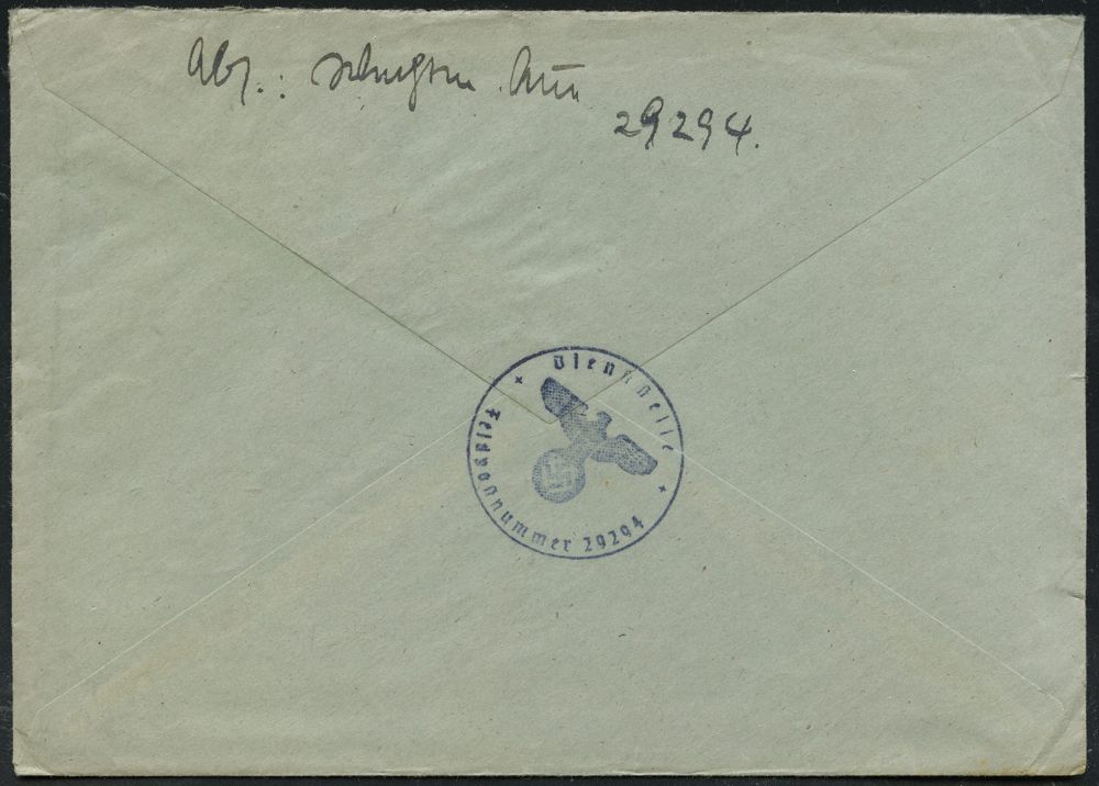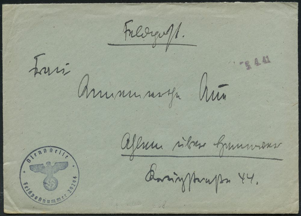| 2724 | 12 € | II WK: ROTES KREUZ / LAZARETTE / SANITÄTSDIENSTE : DEUTSCHES REICH 1941 (5.4.) schw. Datums-1L + blauer 1K-HdN: Feldpostnr. 29294 = Pferde-Lazarett 688 + rs. hs. Abs. + HdN, klar gest. Feldpost-Bf. + Inhalt n. Ahlen | | |