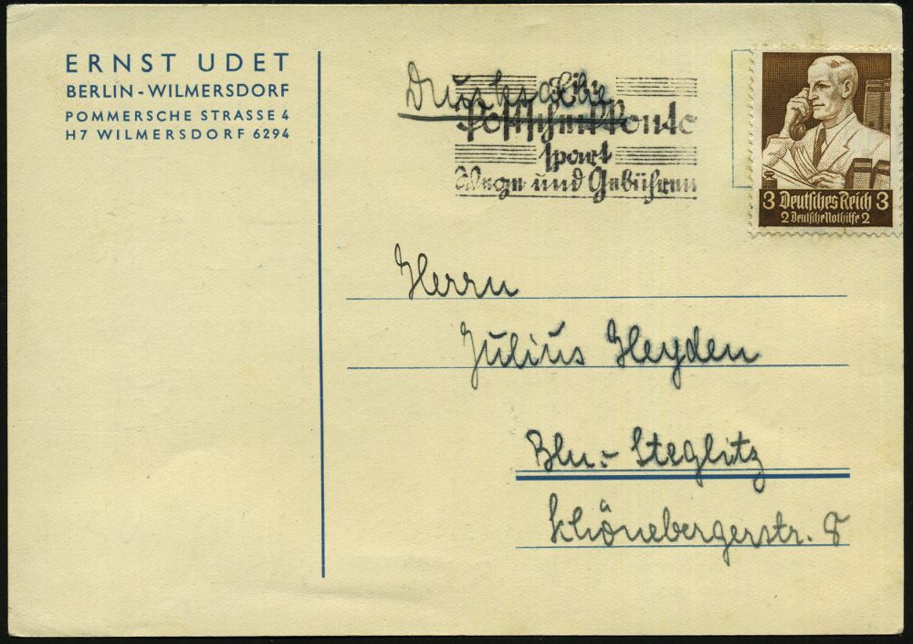 | 2811 | 35 € | DEUTSCHE LUFTWAFFE bis 1945 / DEUTSCHE LUFTRÜSTUNG & INDUSTRIE : Berlin-Wilmersdorf 1936 (28.4.) Dankkarte Ernst Udets zum 40. Geburtstag = Udet mit Sektflaschen + faksimil. Signatur ! (MaWSt Berlin, Stempelkopf fehlt) seltene Bedarfs-Orts-Kt. Udet Flieger-As I. Weltkrieg, NS-Luftwaffen-Inspekteur (Selbstmord 17.11.1941) | | |