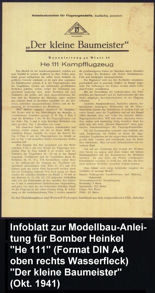 | 2834 | 50 € | DEUTSCHE LUFTWAFFE bis 1945 / DEUTSCHE LUFTRÜSTUNG & INDUSTRIE : Rostock 1941 (10.10.) orig. Briefbogen: ERNST HEINKEL FLUGZEUGWERKE GMBH, SEESTADT ROSTOCK.. Propagandastelle (Firmen-Logo: geflügeltes "H") + gr. Modellplan zum Bau eines Modell-Bombers Heinkel "He 111" (2x kl. Wasserfleck) + Info-Blatt, 4 Belege komplett !, selten! (keine Kopie oder Scan des Modellbogens!) | | |