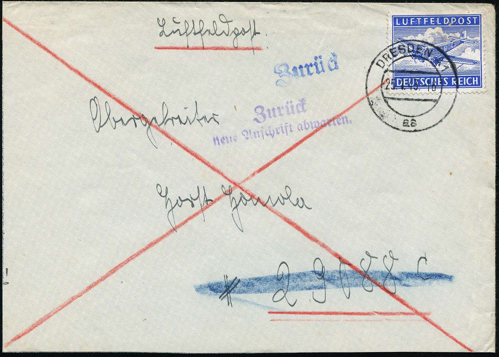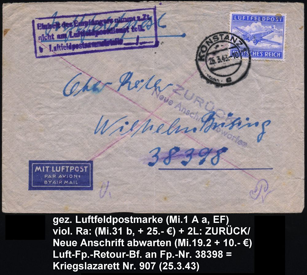 | 2934 | 20 € | II. WELTKRIEG: LUFTWAFFEN-EINHEITEN / LUFTFELDPOST 1939-45 : KONSTANZ 1/ c 1943 (25.3.) 2K-Steg auf Luftfeldpostmke. gez., EF (Ju 52) + viol. Ra.3: Einheit d.Empfängers nimmt z.Zt./nicht am Luftfeldpostdienst teil/b Luftfeldpostsammelstelle___/___ (Mi.31 b + 25.- EUR) + 2L: ZURÜCK/ Neue Anschrift abwarten (+ 10.- EUR) klar gest. Luftfeldposz-Retour-Bf. (schwache Falte) an Fp.-Nr.38 398 = = Kriegslazarett 907, seltene Kombination! (Mi.1 A a) | | |