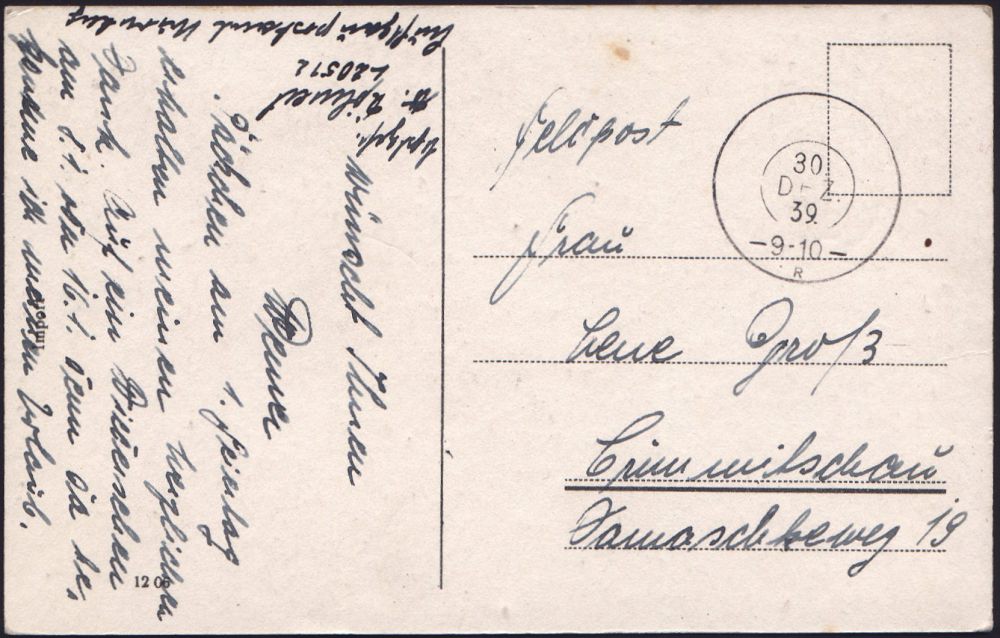 | 2961 | 15 € | II. WELTKRIEG: LUFTWAFFEN-EINHEITEN / LUFTFELDPOST 1939-45 : DEUTSCHES REICH 1939 (30.12.) aptierter, alter bayer. 2K-Reservestempel = Tarnstempel + hs. Abs. Fp. Nr. L 20 512 = I. Gruppe Kampfgeschwader 77 (LGPA Nürnberg ohne Briefstempel) Feldpost-Neujahrs-Ak. n. Crimmitschau | | |