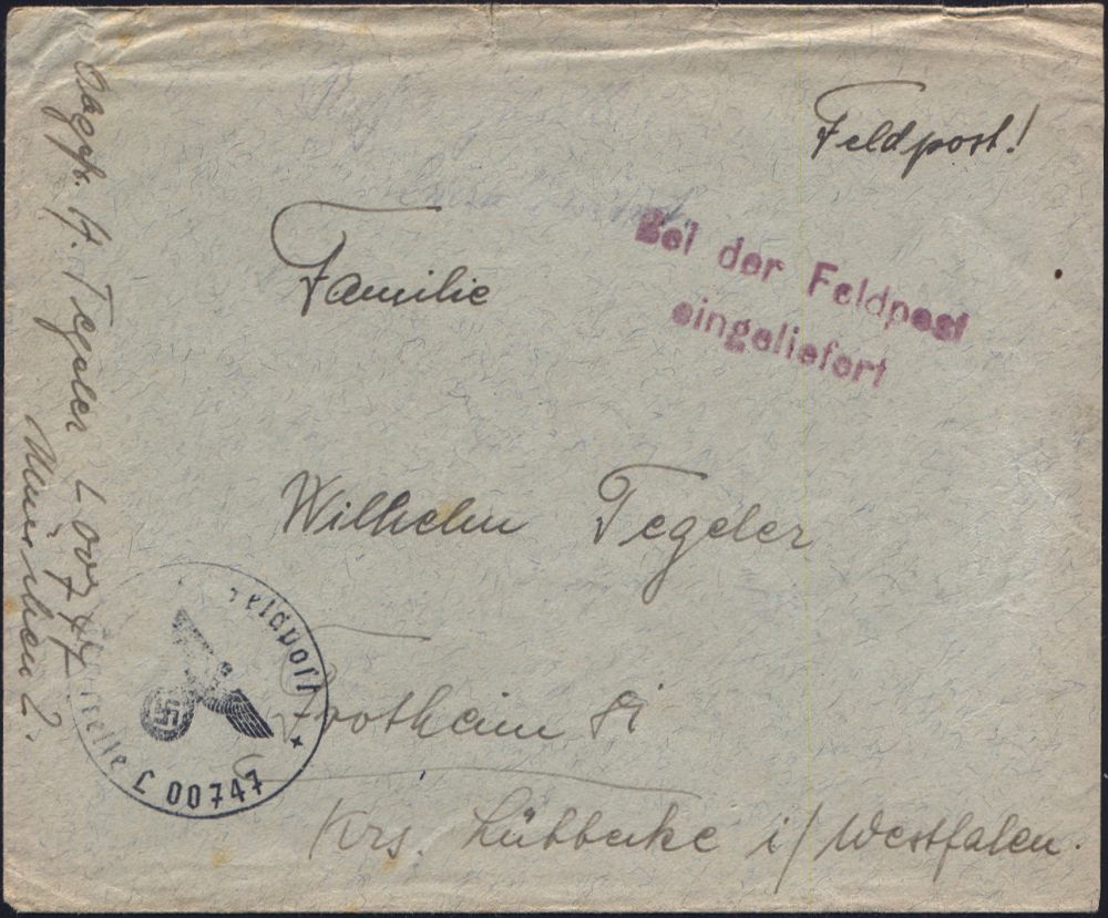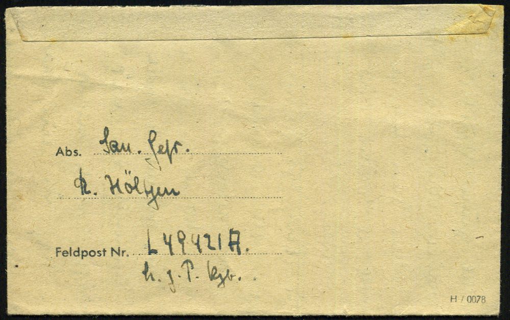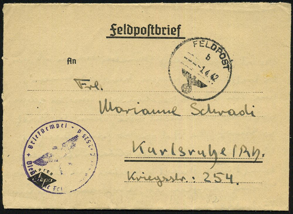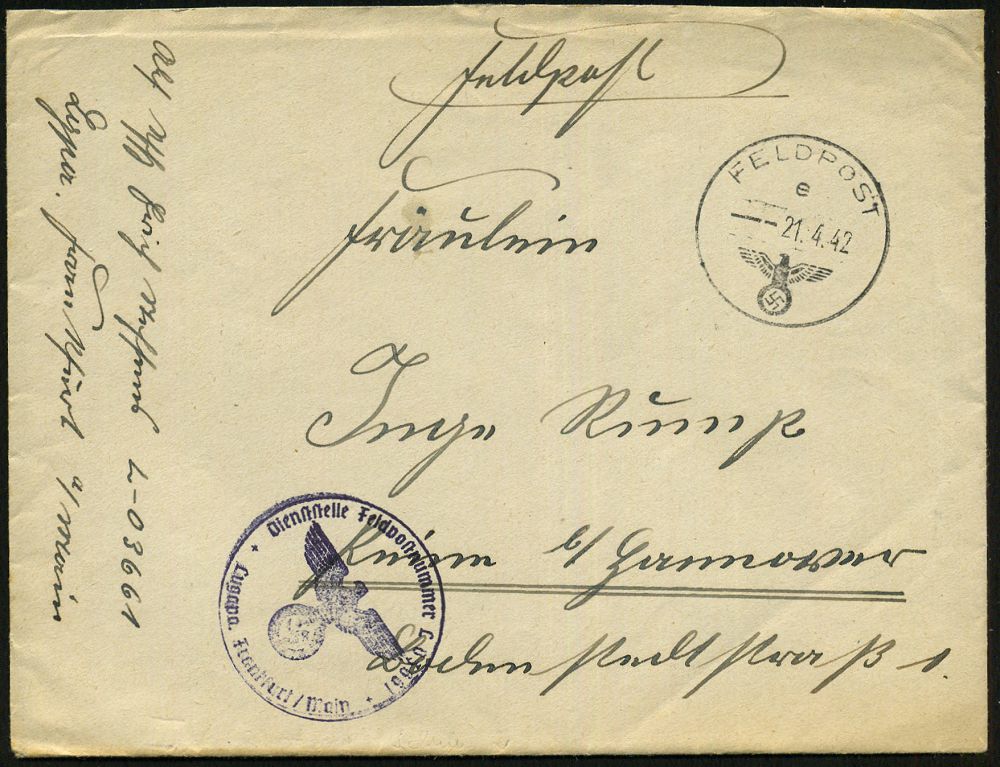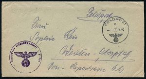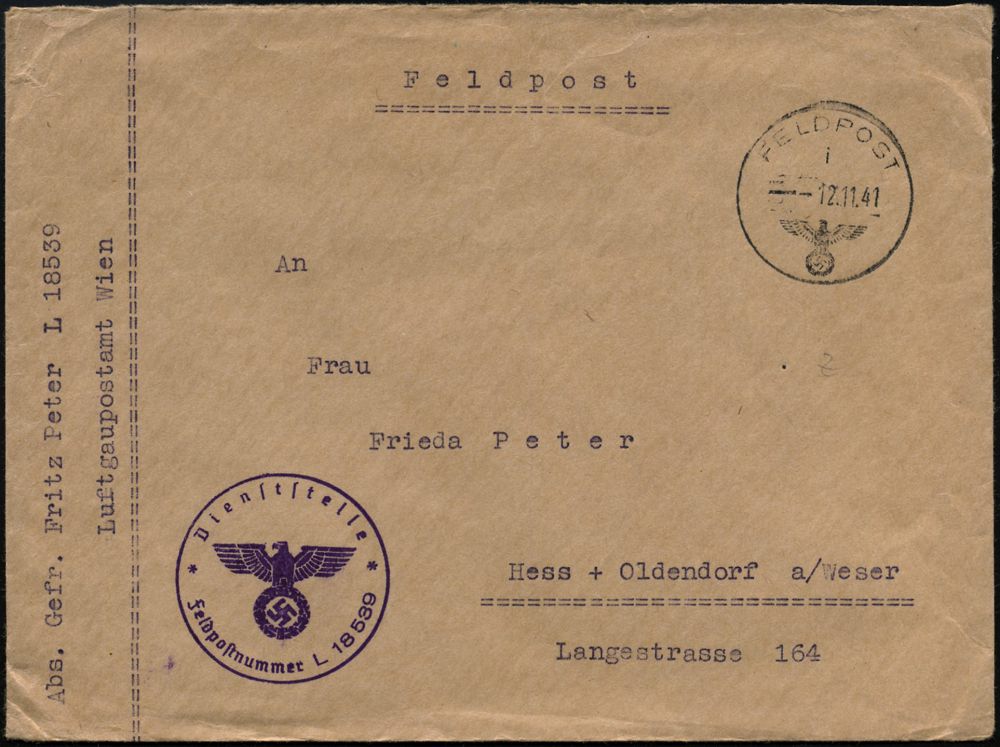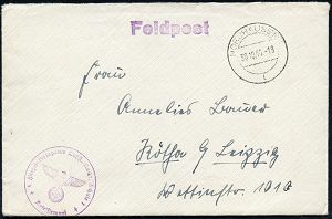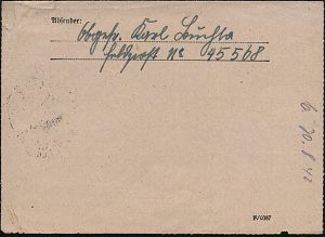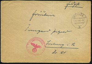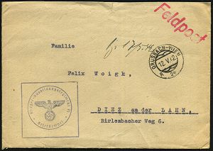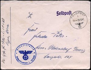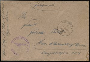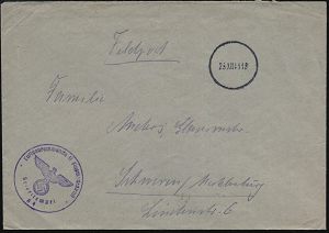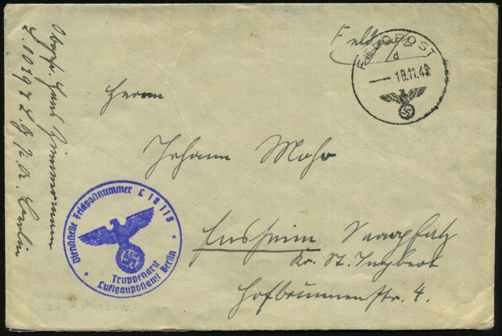 | 2969 | 10 € | II. WELTKRIEG: LUFTWAFFEN-EINHEITEN / LUFTFELDPOST 1939-45 : DEUTSCHES REICH 1942 (14.11.) stummer 2K-Steg = Tarnstempel + viol. 1K-HdN: Dienststelle F. P. Nr. L 50 266 = Luftwaffen-Feld-Div. 8 + vs. hs. Abs.: "..L 50 277 E Lg. Pa. Kbg." (= Königsberg) = Stab u. 9. - 12. Komp. Lw. Feld-Div. 8 , Feldpost-Falt-Bf. mit Inhalt n. Bad Grund | | |