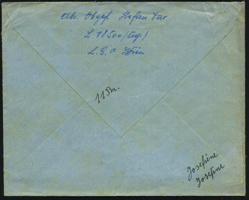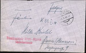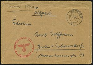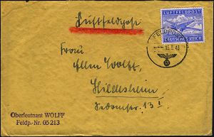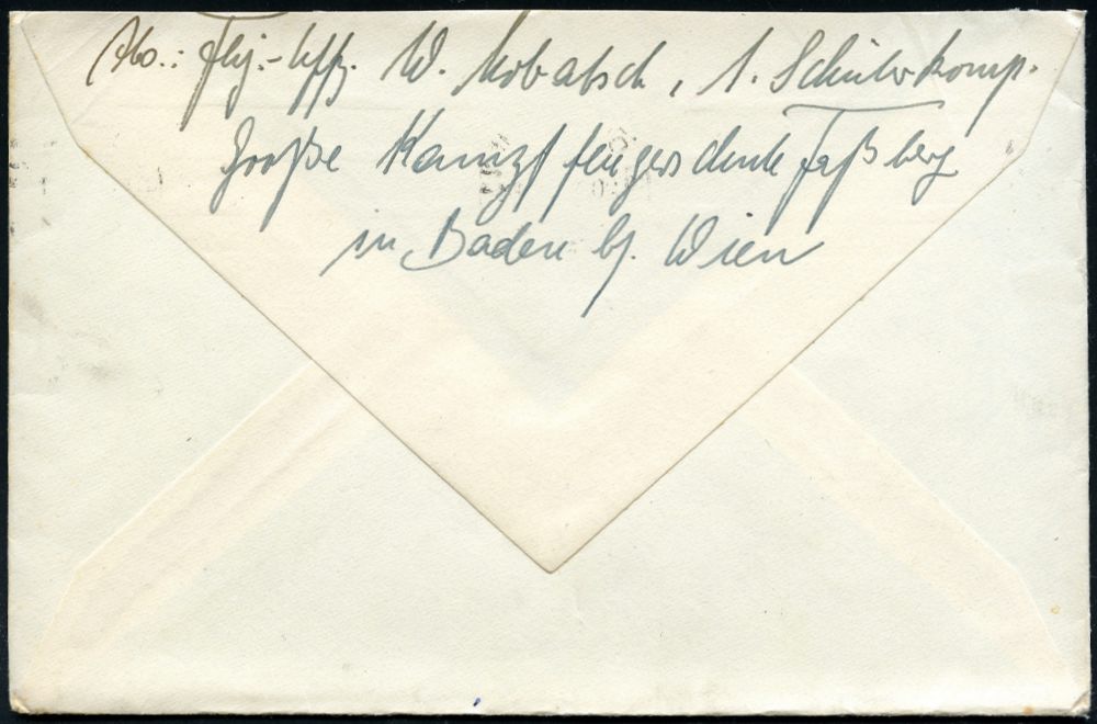 | 2957 | 15 € | II. WELTKRIEG: LUFTWAFFEN-EINHEITEN / LUFTFELDPOST 1939-45 : 21/c WIEN 148/ c 1940 (2.1.) ehem. österr. 1K-Brücke + roter 2L: Blindflugschule Wien-Aspern/Schülerkompanie + rs. hs. Abs., Feldpost-Bf. + Inhalt n. Peine, Aspern ist das älteste Flugfeld Österreichs! | | |