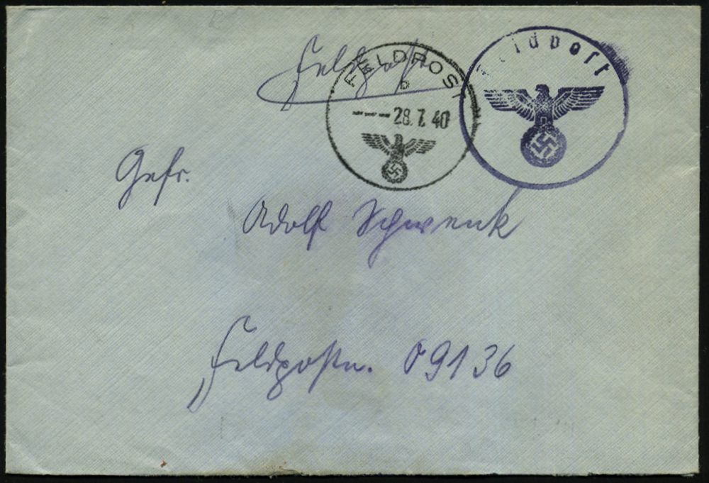 | 2962 | 14 € | II. WELTKRIEG: LUFTWAFFEN-EINHEITEN / LUFTFELDPOST 1939-45 : DEUTSCHES REICH 1940 (28.7.) 1K: FELDPOST/b/-- + schw.-blauer 1K-HdN: Feldpost + rs. hs. Abs.: "L 14 994 Luftgaupostamt Ffm." = Fliegerhorst Kdr. E 15/VII , Feldpost-Bf. an Fp.-Nr. 09136 | | |